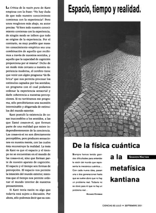 El documento resume las principales ideas de Kant sobre el espacio y el tiempo, y cómo estas ideas anticiparon conceptos modernos en física como la relatividad y la mecánica cuántica. Luego describe brevemente la evolución del concepto de tiempo en física desde Newton hasta Einstein, cuyas teorías mostraron que el tiempo es relativo al observador. Finalmente, introduce conceptos clave de la mecánica cuántica como el dualismo onda-partícula y el principio de incertidumbre de Heisenberg.