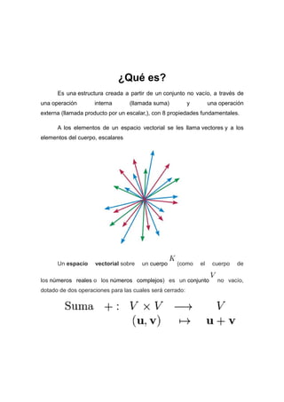 Este documento define y explica los conceptos de espacio vectorial y subespacio vectorial. Un espacio vectorial consiste en un conjunto no vacío con dos operaciones internas, la suma y el producto por un escalar, que cumplen con 8 propiedades fundamentales. Los subespacios vectoriales son subconjuntos de un espacio vectorial que también cumplen con las propiedades de un espacio vectorial. Se proveen ejemplos como Rn y cuerpos como espacios vectoriales.
