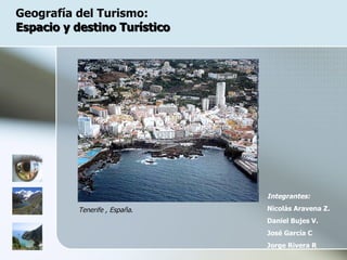 El documento define el espacio turístico como el ámbito donde se desarrolla la actividad turística, que contiene atractivos turísticos e infraestructura. Delimita el espacio turístico considerando factores como la proximidad y contigüidad. Explica que organismos estatales y privados, como comunas y fundaciones, operan el espacio turístico. Finalmente, define el destino turístico como una zona geográfica visitada por turistas con límites físicos y de percepción, influenciada por distancia