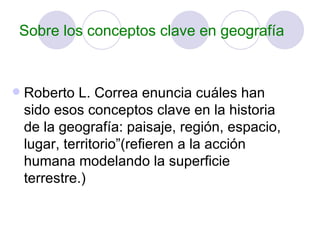 Este documento discute varios conceptos clave en geografía como espacio, territorio, lugar y paisaje. Explica que el espacio geográfico comenzó a ocupar un lugar central en la geografía en la mitad del siglo XX y cómo diferentes corrientes lo conciben de manera distinta. También define territorio como implicando apropiación y control del suelo, y cómo está relacionado con el espacio. Finalmente, analiza cómo las técnicas, normas y redes dan forma material al espacio geográfico.