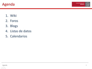 Este documento describe las principales herramientas de comunicación y colaboración disponibles en Espacio 3.0, incluyendo wikis, foros, blogs, listas de datos y calendarios. Explica cómo acceder y utilizar cada una de estas herramientas, como crear contenido nuevo, editar contenido existente y eliminar elementos. Proporciona detalles sobre las características y funcionalidades clave de cada herramienta.