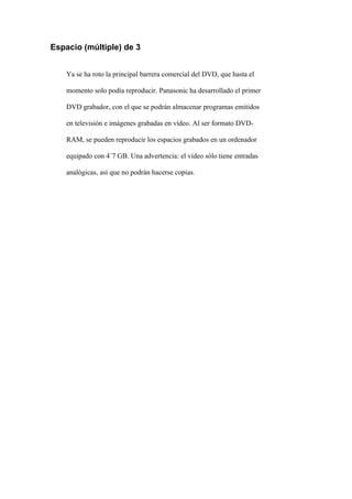 El documento describe el desarrollo del primer grabador de DVD por parte de Panasonic, permitiendo grabar y almacenar programas de televisión y videos en discos DVD-RAM reproducibles en computadoras con 4.7GB de almacenamiento.