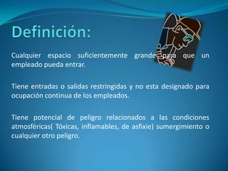 Este documento describe los espacios confinados y los peligros asociados con trabajar en ellos. Define un espacio confinado como cualquier área suficientemente grande para que entre un empleado y que tenga entradas o salidas restringidas. Explica que estos espacios pueden presentar riesgos como deficiencia de oxígeno, gases tóxicos, temperaturas extremas y fuego o explosiones. Resalta la importancia de evaluar los riesgos, aislar el área, limpiar y ventilar el espacio, y usar equipos de protección personal antes