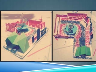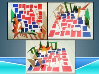 Este documento describe la elaboración de una maqueta que representa los espacios públicos de ciudades antiguas como los foros romanos. Se enumeran los materiales utilizados y se explican los pasos del proceso de construcción, que incluyen el diseño, la construcción de estructuras con volumen y la organización de los elementos. La maqueta incluye elementos abstractos como columnas, arcos y edificios que sintetizan las características de las plazas romanas a través de formas geométricas y colores.