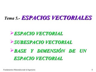 El documento trata sobre espacios vectoriales y subespacios vectoriales. Explica qué es un espacio vectorial y cómo se definen las operaciones de suma y producto por escalares. Presenta ejemplos de espacios vectoriales como el espacio tridimensional, polinomios y matrices. También cubre combinaciones lineales, propiedades de los espacios vectoriales y subespacios vectoriales.