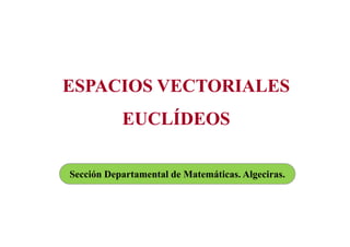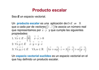 Este documento describe los conceptos fundamentales de los espacios vectoriales euclídeos, incluyendo el producto escalar, módulo de un vector, propiedades del módulo, ángulo entre vectores, ortogonalidad, subespacios ortogonales y bases ortonormales. También presenta el método de Gram-Schmidt para obtener una base ortonormal a partir de una base cualquiera.