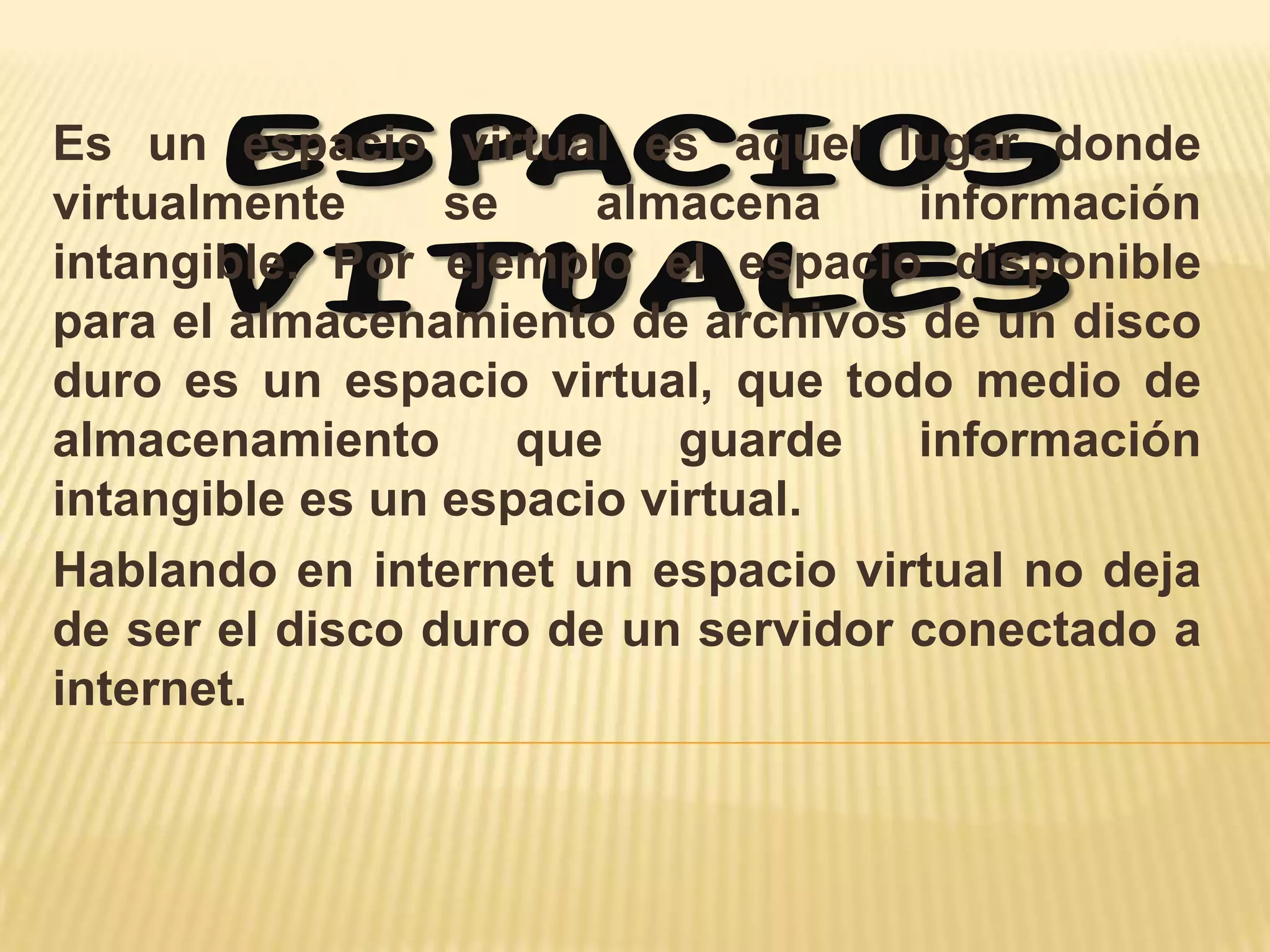 Un espacio virtual es un lugar donde se almacena información intangible como archivos en un disco duro o servidor. Un wiki es un sitio web cuyas páginas pueden ser editadas por múltiples usuarios a través de un navegador, permitiendo la creación y modificación colaborativa de contenido. El primer wiki fue creado por Ward Cunningham y Wikipedia fue creada originalmente usando wiki software. Los wikis permiten la edición y mejora rápida de páginas de forma sencilla, fomentando la participación de usuarios.