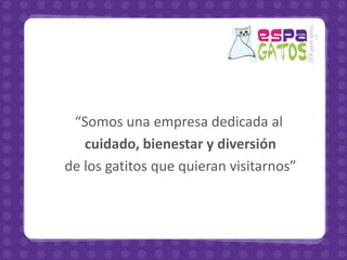 Espagatos SPA es una empresa dedicada al cuidado y bienestar de gatos que ofrece visitas y diversión para los felinos. Proporcionan información de contacto que incluye su página de Facebook, perfil de Facebook, cuentas de Twitter, Pinterest, HiDrive, SlideShare y YouTube, así como su dirección de correo electrónico y código QR.