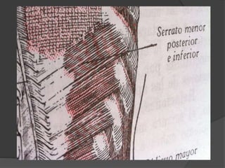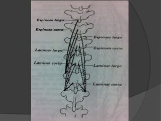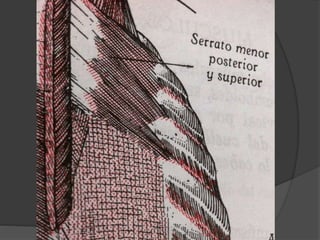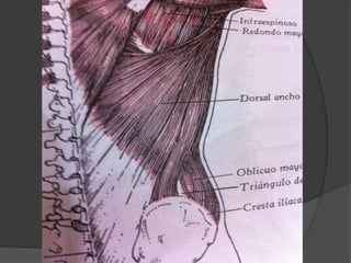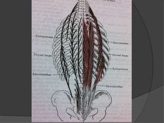 El documento describe la localización, origen, inserción, acción e inervación de varios músculos del cuello, espalda y columna vertebral, incluyendo el trapecio, dorsal ancho, romboides, angular del omóplato, serrato menor posterior e inferior, sacrolumbar, dorsal largo y transverso espinoso.