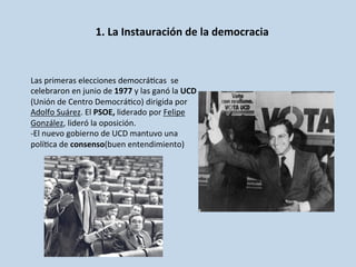 España transicionó a la democracia en la década de 1970 bajo el gobierno de UCD, se aprobó la Constitución de 1978 y se consolidó el Estado social y democrático. En la década de 1980, UCD entró en crisis y el PSOE ganó las elecciones de 1982 iniciando una etapa reformista. En la década de 1990 surgieron escándalos que llevaron al PP al poder en 1996, manteniendo la orientación centrista hasta 2004 cuando el PSOE volvió a ganar tras los atentados del 11M