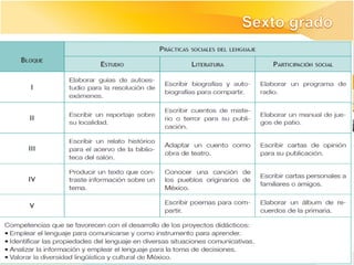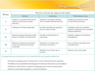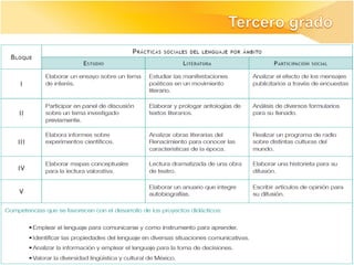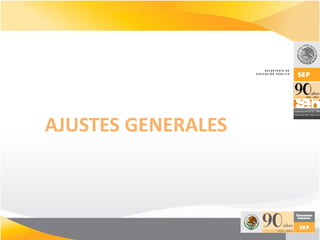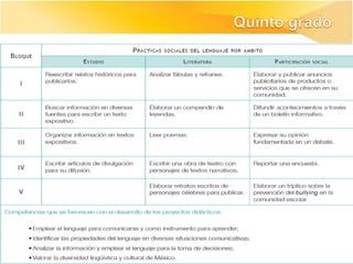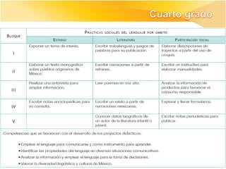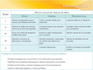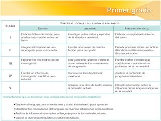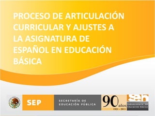 Los documentos describen los ajustes realizados al currículo de la asignatura de Español en educación básica en México, incluyendo la articulación entre los niveles educativos, la revisión de los programas, prácticas sociales del lenguaje, y aprendizajes esperados. El objetivo general fue mejorar la propuesta curricular manteniendo el enfo