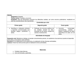 Este documento presenta una planeación para una clase sobre carteles y anuncios publicitarios para estudiantes de primero a tercer grado. La clase incluye actividades diferenciadas por grado que involucran la identificación de elementos en carteles, la creación de carteles propios, y el análisis de anuncios. La evaluación se realizará al inicio, durante y al final de cada actividad para medir el aprendizaje, interés, actitud y participación de los estudiantes.