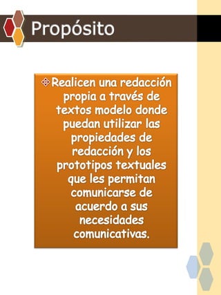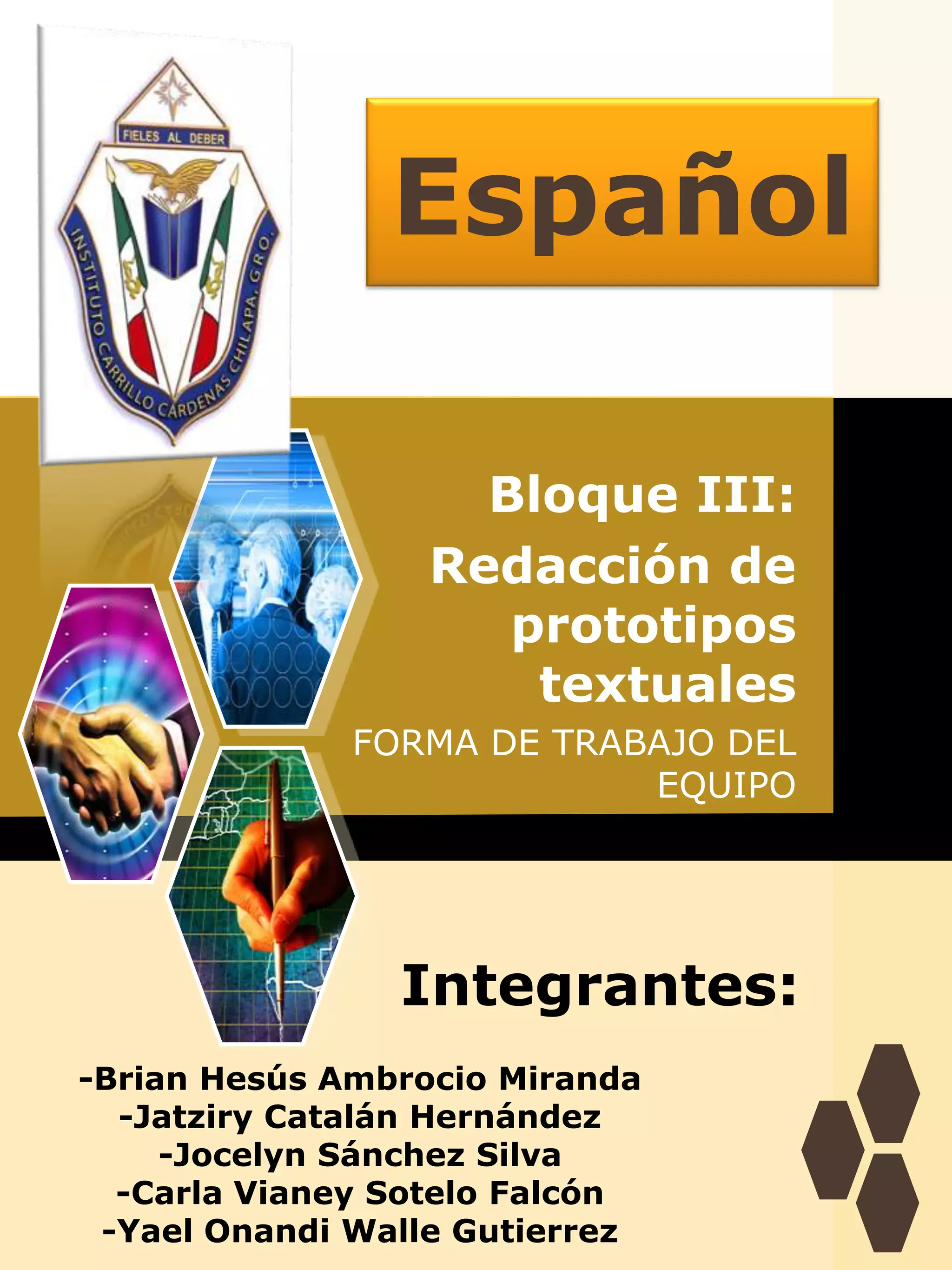 Este documento presenta la forma de trabajo de un equipo de estudiantes para un proyecto de redacción de prototipos textuales. Describe los aprendizajes esperados, las actividades que realizarán como investigación, síntesis de información, exposición de esquemas, análisis de textos y escritura de un borrador y versión final. También presenta los aspectos que serán evaluados como cumplimiento de actividades, comportamiento, asistencia, entrega de trabajos a tiempo y participación.