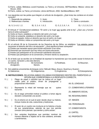 Este documento presenta un primer instrumento de evaluación bimestral para la asignatura de Español II. Contiene 30 preguntas de opción múltiple sobre temas lingüísticos como indigenismos, extranjerismos y regionalismos. Además, incluye preguntas sobre la comprensión de textos y sobre conceptos legales establecidos en la constitución mexicana.
