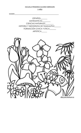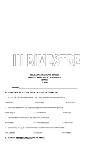 Este documento es un examen de español correspondiente al tercer bimestre de tercer grado de primaria. Contiene diferentes secciones como rellenar círculos con respuestas correctas, ordenar palabras alfabéticamente, completar palabras con letras, identificar tiempos verbales, conjugar verbos en diferentes tiempos y redactar un anuncio basado en un dibujo. El examen evalúa conceptos gramaticales y ortográficos propios del nivel.