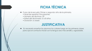 El plan de aula se enfoca en enseñar los colores básicos a niños de 6 a 8 años de edad en las primeras clases de español. A lo largo de 6 clases, los estudiantes aprenderán los nombres de los colores a través de tarjetas, canciones, actividades de colorear y recortar, y trabajarán en equipos para crear un cartel que muestre los colores. El objetivo es que los niños aprendan los colores de una manera simple y divertida que también promueva el trabajo en equipo.