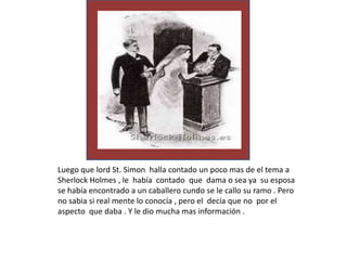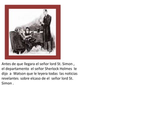 Lord St. Simon visita a Sherlock Holmes para contarle sobre su esposa, quien desapareció después de su boda. Holmes deduce que la esposa huyó con un hombre que recogió su ramo en la boda y con quien ella había prometido casarse años atrás. Más tarde, Holmes resuelve el caso al darse cuenta que la nota en el bolso de la novia indicaba el hotel donde se estaba quedando con su amante.