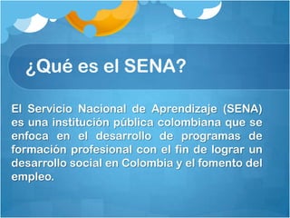 El SENA es una institución pública colombiana creada en 1957 para ofrecer formación profesional a los trabajadores colombianos y así contribuir al desarrollo social y económico del país. El SENA se enfoca en programas de formación profesional con el objetivo de aumentar la productividad nacional y promover el desarrollo equitativo de Colombia.