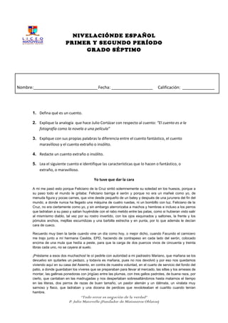 Este documento presenta un plan de estudio para el nivelamiento de español en el primer y segundo período del grado séptimo. Incluye instrucciones para tareas como definir cuentos, explicar analogías literarias, identificar características de diferentes tipos de cuentos, redactar un cuento extraño o insólito, y analizar cuentos cortos. También incluye preguntas sobre la función del narrador y diferentes tipos de estructura narrativa.