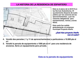 Este documento describe la historia de un proyecto de viviendas llamado "Residencial La Estrella" en Atarfe, Granada. La empresa municipal Proyecto Atarfe recibió terrenos públicos para equipamientos, los cuales vendió a bajo precio a una promotora privada con la condición de que se usaran para equipamientos. Sin embargo, la promotora construyó 116 apartamentos y locales comerciales sin cumplir con este requisito. El Ayuntamiento concedió las licencias sin comprobar el uso real de la parcela.