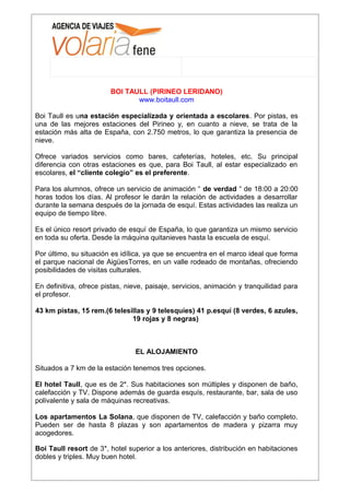 El documento proporciona información sobre varias estaciones de esquí en los Pirineos españoles y franceses, incluidos detalles sobre las pistas, alojamientos y precios. En particular, describe a Boi Taull en el Pirineo leridano español, que se especializa en grupos escolares y ofrece varios servicios y actividades para estudiantes. También menciona a Saint Lary en el Pirineo francés, que cuenta con más de 100 km de pistas y numerosos servicios adicionales para los visitantes. Finalmente, brinda detal