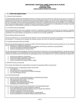 Este documento presenta el plan de estudios para una especialidad en Técnico en Sistemas en la Institución Educativa Jorge Isaacs de El Placer. La especialidad se enfoca en enseñar sobre sistemas, hardware, software, redes y mantenimiento de computadores para preparar a los estudiantes para trabajos en tecnología o continuar su educación en carreras relacionadas con la informática. El plan describe los perfiles requeridos para docentes y estudiantes, las proyecciones laborales y académicas de los graduados, y la organización de las as