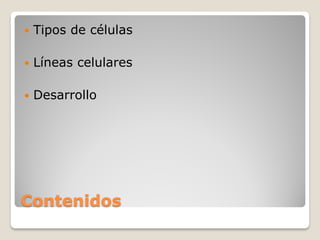 Este documento describe los tipos de células en el cuerpo y cómo se desarrollan. Explica que las células tienen características morfológicas y funcionales asociadas a sus tareas. También describe cómo las células se asocian para formar tejidos compuestos de células similares. Finalmente, resume los procesos de proliferación celular, migración, destino y diferenciación que permiten la formación de los diversos tipos de células durante el desarrollo embrionario.