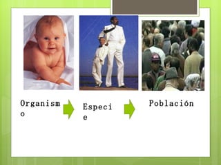 El documento explica los conceptos de especie, población, especiación y los tipos de especiación. La especiación es el proceso mediante el cual una población da lugar a otra(s) población(es) reproductivamente aislada(s) que con el tiempo acumularán diferencias genéticas. Existen dos tipos principales de especiación: alopátrica, que ocurre cuando poblaciones quedan aisladas geográficamente, y simpátrica, cuando el aislamiento se da sin barreras geográficas.