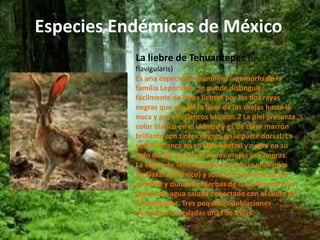 El documento describe diversas especies endémicas de México, incluyendo la iguana de cola espinosa, la liebre de Tehuantepec, el mapache, el lobo mexicano, el teporingo, el zorro pigmeo, la tortuga de Cuatro Ciénegas, la tortuga del desierto, el sapo cresta grande, la víbora cascabel, la cecilia oaxaqueña, la serpiente coralillo, los ajolotes, el pez Julimes, el mexcalpique, la vaquita marina, el pájaro trogon