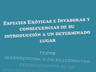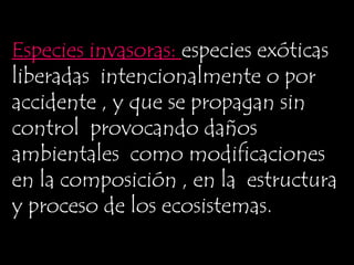 El documento habla sobre las especies invasoras y exóticas, definidas como organismos no autóctonos que pueden establecerse y reproducirse fuera de su hábitat natural. Las especies invasoras como la rana toro y el eucalipto se propagan sin control y causan daños a los ecosistemas, amenazando a las especies nativas, modificando los ecosistemas y generando mayores costos de control y mantenimiento. Algunas consecuencias negativas incluyen la pérdida de especies nativas, pérdidas