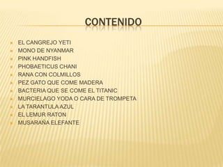 Este documento presenta descripciones breves de varias especies recientemente descubiertas o poco conocidas, incluyendo el cangrejo yeti, un mono descubierto en Myanmar, un pez rosado con manos, el insecto más largo conocido, una rana con colmillos, un pez gato que come madera, una bacteria que se come el Titanic, un murciélago con cara de Yoda, una tarántula azul, un lémur ratón y una musaraña elefante.