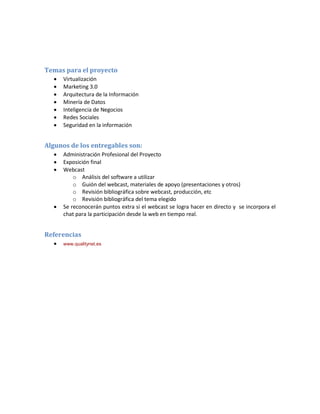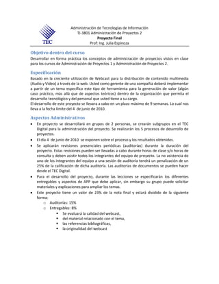Este documento describe un proyecto final para un curso de administración de proyectos de TI. Los estudiantes trabajarán en grupos de 2 personas para implementar un webcast multimedia sobre un tema de TI como virtualización o redes sociales durante un período de 9 semanas. El proyecto será evaluado a través de auditorías periódicas y entregables como un plan de administración de proyectos, el webcast y materiales de apoyo, y una exposición final.
