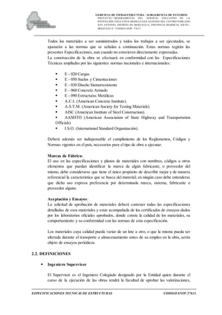 Este documento presenta las especificaciones técnicas generales para el proyecto de mejoramiento del servicio educativo de la Institución Educativa Modelo San Antonio en Moquegua, Perú. Incluye objetivos, normatividad, definiciones, métodos de medición, errores u omisiones y calificaciones de materiales. El proyecto busca mejorar la educación mediante la construcción de nuevas instalaciones escolares siguiendo las especificaciones técnicas detalladas.