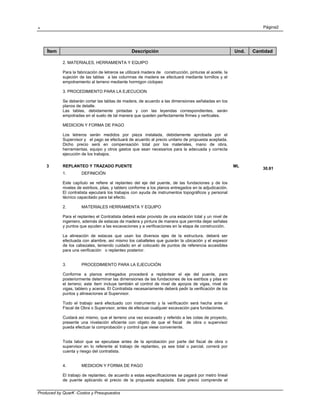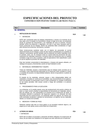 Este documento presenta las especificaciones técnicas para la construcción de un puente vehicular en Mayu Palca, incluyendo la instalación de faenas, letreros de obra, replanteo y trazado del puente, y una placa conmemorativa. Detalla los materiales, herramientas, equipos, procedimientos y mediciones requeridos para cada ítem, como excavaciones en roca, relleno compactado, retiro de escombros y hormigón para las fundaciones. El documento provee la información necesaria para presupuestar y ejecutar correct