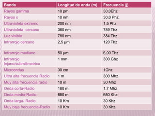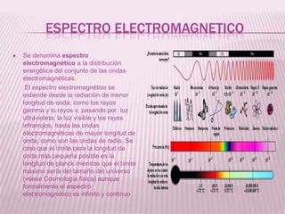 El espectro electromagnético abarca todo el rango de radiaciones electromagnéticas desde ondas de radio de baja frecuencia hasta rayos gamma de alta frecuencia. Se divide en segmentos como infrarrojo, luz visible, ultravioleta, rayos X y rayos gamma. Cada segmento tiene longitudes de onda específicas y usos como comunicaciones, calentamiento, visión e imágenes médicas.