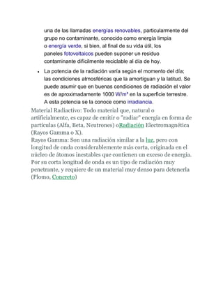 El documento describe el espectro electromagnético, que distribuye las diferentes longitudes de onda desde las ondas de radio hasta los rayos gamma. Todas las ondas electromagnéticas son campos de fuerza eléctricos y magnéticos móviles cuya velocidad depende del medio por el que viajan.