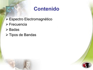 Este documento describe el espectro electromagnético dividiéndolo en diferentes bandas de frecuencia, incluyendo frecuencias extremadamente bajas (ELF), súper bajas (SLF), ultra bajas (ULF), muy bajas (VLF), bajas (LF), medias (MF), altas (HF), muy altas (VHF), ultra altas (UHF), súper altas (SHF) y extremadamente altas (EHF), y explica los usos típicos de cada rango de frecuencia.
