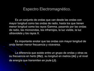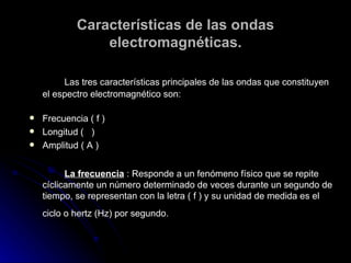 El documento describe el espectro electromagnético, que incluye ondas con diferentes longitudes de onda y frecuencias, desde ondas de radio hasta rayos gamma. Las tres características principales de las ondas electromagnéticas son la frecuencia, la longitud de onda y la amplitud. La frecuencia se refiere al número de ciclos por segundo, la longitud de onda a cómo se propagan las ondas a través del espacio, y la amplitud al valor máximo de la cresta de la onda. El espectro de radiofrecuencia se aplica a la porción menos