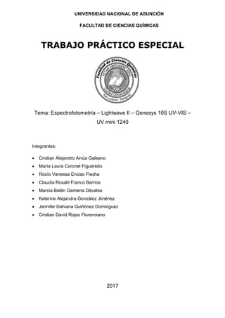 El documento describe un trabajo práctico sobre el uso y funcionamiento de espectrofotómetros, enfocándose en modelos como Lightwave II, Genesys 10S UV-Vis y Shimadzu UV-Mini 1240. Se presentan objetivos generales y específicos, así como procedimientos detallados para la operación de cada tipo de espectrofotómetro. Además, se destaca la importancia de la espectrofotometría en el análisis cuantitativo de soluciones y la identificación de compuestos químicos.