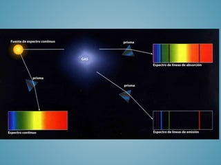 El documento describe el descubrimiento del espectro de la luz por Isaac Newton en 1666 y cómo su experimento con un prisma mostró que la luz blanca está compuesta por diferentes colores. Explica que la palabra "espectro" proviene del latín "spectrum" y significa "fantasma". Además, resume brevemente el desarrollo del espectroscopio y cómo se ha utilizado para analizar el espectro electromagnético y los espectros de absorción y emisión de los elementos químicos.