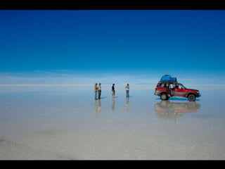 El Salar de Uyuni en Bolivia es el mayor desierto de sal del mundo con 12.000 km2. Ubicado a 3.650 metros sobre el nivel del mar en el Altiplano, el Salar se convierte en un gran espejo cuando está cubierto de agua y contiene aproximadamente 11 capas de sal de varios metros de espesor. Se extraen anualmente 25.000 toneladas de las 10 mil millones de toneladas de sal estimadas en el Salar.