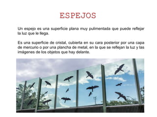 Un espejo es una superficie plana y pulimentada que puede reflejar la luz. Los cuerpos se comportan de tres maneras ante la luz: cuerpos transparentes que dejan pasar casi toda la luz, cuerpos translúcidos que dejan pasar una porción, y cuerpos opacos que no dejan pasar la luz.