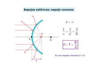 Los espejos son superficies lisas y reflejantes que pueden ser planos, cóncavos o convexos. Los espejos planos producen imágenes virtuales e invertidas del mismo tamaño que el objeto, mientras que los espejos cóncavos producen imágenes reales, invertidas y que varían de tamaño dependiendo de la distancia del objeto al centro de curvatura, y los espejos convexos siempre producen imágenes virtuales, derechas y más pequeñas que el objeto.