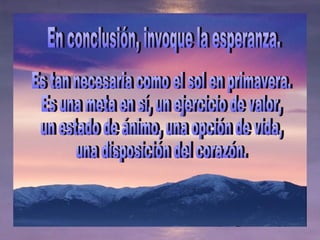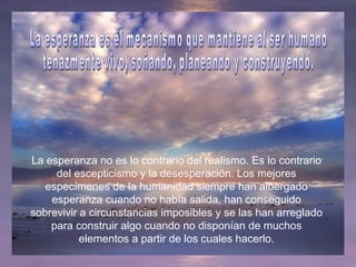 Este documento discute la importancia y el poder de la esperanza. Argumenta que la esperanza no es lo opuesto al realismo, sino al escepticismo y la desesperación. Señala que la esperanza ha ayudado a los seres humanos a sobrevivir circunstancias imposibles y a construir algo cuando no tenían mucho. También cita estudios que muestran que los prisioneros de guerra con esperanza tuvieron menos traumas, y que recuperar la fe nos permite tomar el control de nuestras vidas.