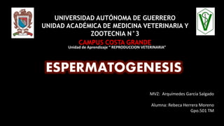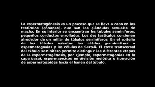 El documento describe las etapas de la espermatogénesis, el proceso de formación de espermatozoides que ocurre en los testículos masculinos. La espermatogénesis incluye cuatro etapas principales: la fase de Golgi, la fase de maduración, la fase acrosómica y la fase de encasquetamiento. En los túbulos seminíferos de los testículos se encuentran las células germinales en diferentes etapas del proceso, como espermatogonias, espermatocitos y espermatozoides maduros.