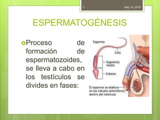 El proceso de espermatogénesis comprende tres fases: crecimiento, maduración y espermatogénesis. En la ovogénesis, las oogoneas se dividen y crecen hasta convertirse en oocitos primarios. La fecundación implica la unión del espermatozoide y el ovulo para formar el cigoto.