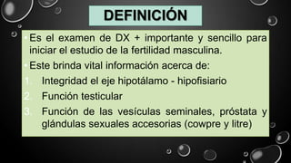 Este documento proporciona una definición y descripción del examen de espermiograma, evaluando aspectos físicos y celulares del semen como volumen, pH, número y morfología de los espermatozoides. Explica cómo se evalúan parámetros bioquímicos e inmunológicos del líquido seminal y proporciona instrucciones sobre la recolección y análisis de muestras. Además, detalla pruebas funcionales adicionales para evaluar la integridad de la membrana espermática y la cond