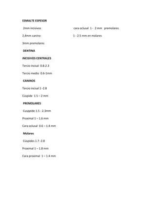 El documento resume los espesores típicos de esmalte y dentina en diferentes dientes. El espesor de esmalte varía de 2 a 3 mm dependiendo de la ubicación en los incisivos, caninos y premolares. La dentina también varía en espesor según la ubicación, siendo más delgada en los tercios incisales e incisivos centrales y más gruesa en las cúspides de los molares y premolares.