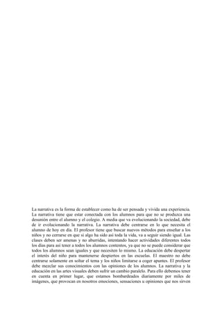 La educación de las artes visuales necesita una nueva narrativa que se centre en las necesidades e intereses de los estudiantes de hoy en día. La narrativa debe evolucionar junto con la sociedad y utilizar métodos de enseñanza más dinámicos e interactivos para mantener a los estudiantes comprometidos. También es importante que los estudiantes aprendan a analizar y cuestionar críticamente las imágenes y la cultura visual que los rodea para que no se conviertan en consumidores pasivos.