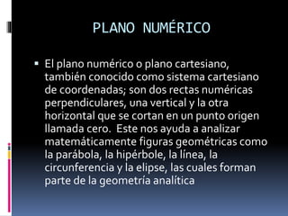 El documento describe los conceptos básicos del plano cartesiano o numérico, incluyendo sus ejes, cuadrantes, y cómo se usa para describir la posición de puntos. También explica conceptos como distancia, punto medio, ecuaciones y cómo trazar figuras geométricas como circunferencias, parábolas, elipses e hipérboles en el plano cartesiano.